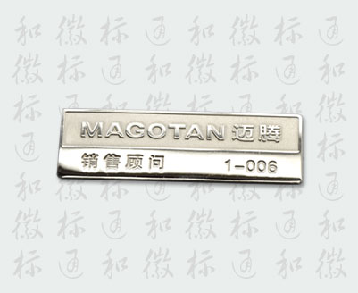 胸牌工号牌一般用于服务行业,商场、宾馆、餐饮等方面,便于顾客及单位对员工的服务监督。材质方面有铜、型铝、不锈钢、亚克力等,工艺方面大都以咬板、丝印为主,也可根椐客户进多种工艺选择搭配……